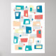 Elevez votre espace avec cette affiche moderne de l'Âge Atomique du milieu du siècle avec des rectangles et étoiles funky en bleu céladon, pêche, turquoise, jaune et corail. Parfait pour les amateurs de design rétro et de motifs géométriques, ce mur d'art ajoute une touche de charme vintage à toute décoration d'intérieur. Idéal pour les amateurs de style années 50 et 60.