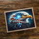 Un majestueux aigle chauve arborant fièrement sur sa tête un drapeau américain, symbolisant la force, la liberté et le patriotisme.