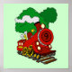 Un mignon train de dessin animé avec le numéro 9 à l'avant et la fumée venant de la cheminée et des arbres dans l'arrière - plan.