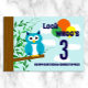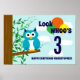 Regarde qui a un anniversaire ! Chouette bleue amusante dans une scène boisée avec ciel bleu et nuages moelleux