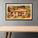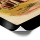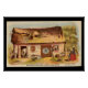 Amusante femme souffle, "Bonté Gracieuse quel long cheval" à voir un cheval tête dans la fenêtre de la grange à droite, avec la queue à gauche dans la porte de la grange. Une publicité éphémère pour les poêles dans une illustration colorée.