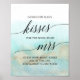 Cette affiche de devinette de bisous de plage aqua et or est une activité amusante pour une baby shower tropicale de mariage. Remplissez un pot avec des Hersey's Kisses et demandez à vos invités de deviner combien de bonbons il y a dans le pot. La réponse la plus proche gagne un prix ! Le design simple et moderne présente une aquarelle turquoise, teal et bleu clair époustouflante avec une étincelle dorée douce rappelant le sable et la mer. Elle est associée à une calligraphie élégante magnifique.