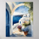 Santorin, connue pour son architecture particulière et ses vues magnifiques sur la côte. Le premier plan montre un passage voûté avec une porte bleue vibrante sur la gauche, qui contraste joliment avec les murs blancs. Une cascade de verdure surplombe l'arc, apportant une touche de nature aux structures artificielles. Une série de marches blanches descendent à travers le cadre, flanqué de bâtiments blanchis à la chaux avec des dômes et des accents, caractéristiques de l'architecture cycladique. Deux grands pots en terre cuite remplis de fleurs roses et bleues fleuries, contribuent au charme de la scène. Dans l'arrière - plan, la mer bleue profonde s'étend jusqu'à l'horizon, rejoignant le ciel bleu plus clair au-dessus. Le littoral est accidenté et vallonné, avec des couches de différentes nuances de bleu suggérant profondeur et distance. L'ensemble est serein et accueillant, saisissant l'essence d'un paradis méditerranéen.