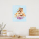 Poster avec un joli tableau aquarelle d'un lion-mère tenant son bébé. Un joli bouquet fleuri violet en dessous ajoute une touche douce à cette image douce et adorable. Arrière - plan bleu clair.