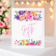 Un signe cadeau de douche nuptiale fleurie de jardin rose vif avec des fleurs rose, rouge, violet, orange et feuilles d'eucalyptus vertes peints à la main et feuillage vert avec une police de brosse à script moderne.