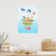 Une affiche avec une illustration de style nurserie mignonne d'une arche remplie d'animaux sauvages et d'un papillon volant au-dessus et d'une baleine amicale crachant de l'eau en dessous. Quelques nuages bleus flottent au passage. Sur un fond ombré bleu clair.