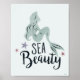 Ariel, en forme d'aquarelle, assis parmi les étoiles de mer, avec les mots "Beauté de la mer" écrits ci-dessous.