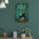 An elegant black cat silhouette stretches gracefully with a golden curved tail forming a perfect arc, framed by teal fan rays and architectural accents. This refined 1920s art deco composition captures poised sophistication, making it ideal for yoga studios, living rooms and modern spaces where cat lovers seek stylish, timeless decor.
