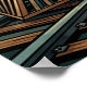 Art Deco Western Express train wall art featuring a stylized steam locomotive crossing a rugged desert landscape with geometric mountains and saguaro cacti. Intricate Art Deco patterns in the smoke trails and engine details are rendered in deep teal, bronze, and golden sunset tones.