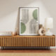 Un art abstrait minimal avec un design géométrique du milieu du siècle dans la sauge et noir sur un arrière - plan blanc cassé. Un accessoire maison parfait pour un minimaliste.