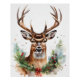 L’image présente une aquarelle illustrant la tête d’un cerf avec des bois proéminents. Le cerf est centré dans la composition, avec son visage et des bois détaillés et réalistes. Autour du cou du cerf se trouvent le feuillage vert et les baies rouges, suggérant un thème de vacances ou d’hiver. Un arc rouge est attaché autour du feuillage au centre du bas, ajoutant à l'aspect festif. L’arrière - plan se compose de éclaboussures d’aquarelle, faiblement appliquées, dans les tons cool, qui complètent les brins chauds de la fourrure de cerf. Cette image pourrait être pertinente pour la décoration saisonnière ou comme exemple d'art de la faune.