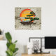 affiche asiatique bonsaï et soleil sur mesure, avec un bonsaï, des rouleaux et des tourbillons et un grand soleil sur le dos sur l'arrière - plan grunge.