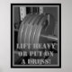 Un poster noir et blanc, avec cinq assiettes de poids au bar. Il a une bordure noire et grise, avec l'expression "LIFT LOURD OU METTRE SUR UNE ROBE!" écrit dessus. Une affiche à ne pas manquer pour quiconque prend son entraînement au sérieux ! Poids, Exercice, Salle De Sport, Motivation.