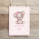 Pour la table de tombola Diaper à votre baby shower. Joli ours brun fille sur une couverture rose bébé avec l'ourlet cousu. Texte "Déchets".