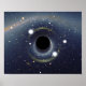 Vue simulée d'un trou noir devant le Grand Nuage Magellanique. Le rapport entre le trou noir du rayon de Schwarzschild et la distance de l'observateur est de 1:9. Il convient de noter l'effet de lentille gravitationnelle connu sous le nom d'anneau Einstein, qui produit un ensemble de deux images du Nuage assez lumineuses et grandes mais fortement déformées par rapport à sa taille angulaire réelle.