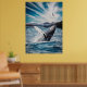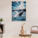 Une image d'une baleine qui se brise avec des montagnes enneigées et une forêt dans l'arrière - plan avec un troupeau d'oiseaux volants dans le ciel.