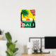 Une célébration de Bali Indonésie modelée sur les affiches de style voyage vintage du passé. L'illustration tropicale aux couleurs vives comprend un coucher de soleil sur l'océan, des fleurs stylisées de palmiers et de frangipaniers, et une silhouette d'un temple balinais. Art original © Visuaria Publishing.