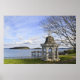 Il s'agit d'une image basse résolution pour le web, l'impression que vous obtiendrez a des détails pointus. Le paysage classique dans un parfait équilibre entre couleurs et perspective. Rafraîchissant et dynamique à regarder. Bar Harbour, Maine, vue sur l'océan depuis un belvédère, avec des branches d'arbres et une jetée, et un aperçu des montagnes de l'arrière - plan, surmonté d'un ciel bleu croustillant aux nuages moelleux. Photographie de Minerva Bloom.