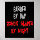 Cette conception de texte étrange avec la citation "Barber by Day Zombie Slayer by Night" dans l'écriture rouge sang, est parfait pour tout barbier qui aime les zombies.