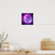 Une chauve-souris violette portant un casquette de sorcière vole devant une lune brillante de croissant aux étoiles brillantes qui l'entoure.