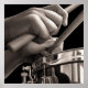 Cette peinture à l'huile hyperréaliste extrêmement détaillée de Jeff Bartels représente un homme qui joue de la batterie. L'image, en noir et blanc, est rognée de près par les deux mains du batteur tenant des bâtons de tambour avec un piège au bas du tableau. Une lumière forte et des ombres, ainsi que la culture serrée donnent à ce tableau une sensation frappante et dramatique.