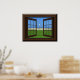 Cette affiche présente un magnifique parcours de golf par une fenêtre ouverte.