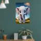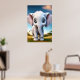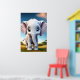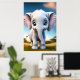 Poster d'un petit éléphant mignon et animé aux grands yeux expressifs, debout dans un champ herbacé sous un ciel lumineux. L'éléphant a une expression joyeuse, ornée de couleurs douces et pastel qui rehaussent sa nature ludique.