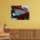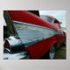 Une photo basse et proche du côté d'un classique Chevy Bel Air rouge et blanc de l'arrière, capturant cette nageoire extraordinaire!