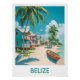 Tropical illustration of Belize featuring a sandy beach lined with colorful stilt houses, palm trees, and turquoise sea. A bright and exotic poster perfect for summer-themed wall decoration.