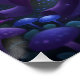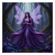 Une belle fée portant une robe violette coulante et un collier d'améthystes avec des violettes dans ses longs cheveux violets et des ailes violettes violettes légères en forme de libellule pourpre tenant une violette se dresse dans une forêt magique entourée de champignons colorés, de fleurs et d'arbres mossy recouverts de vignes.