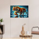 Un majestueux tigre du Bengale, symbole d'une puissance indomptée, s'étend à travers l'océan peu profond et turquoise, et envoie des éclats de mousse blanche dans l'air. Les muscles puissants du tigre se répandent sous ses rayures emblématiques orange et noire tandis qu'il se déplace dynamiquement à travers l'eau. La scène capture le bleu vif de l'océan, le blanc éclatant du surf scintillant, et la lumière scintillante du soleil, créant une image de mouvement exaltant et d'énergie brute. L'arrière - plan océanique doux et flou met l'accent sur la présence frappante du tigre.