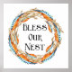 Belle affiche de carré d'aquarelle Boho avec une couronne de plumes avec le texte central "Bless Our Nest".