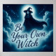 This whimsical poster features a mysterious witch in a flowing black dress and pointed hat stands against a glowing full moon, surrounded by stars and clouds, inspiring self-empowerment. Finished as a mixed media art print.