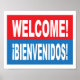 Bienvenue aux invités à votre événement en anglais et en espagnol avec une enseigne lumineuse et bleue.