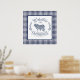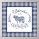 Stylisé carré imprimé avec le centre "Bienvenue à la ferme" texte avec silhouettes d'animaux de ferme et un arrière - plan bleu en vichy