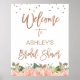 Affiche de bienvenue pour une réception de mariage floral couleur pêche aquarelle douce avec texte calligraphié en or rose faux.