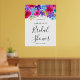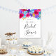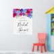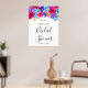 Des fleurs d'hydrangea bleu vif, des roses violettes profondes et des fleurs tropicales rose magenta créent un arrangement floral vibrant. La réception de mariage est écrite en calligraphie moderne. Ce panneau de bienvenue fait partie de la collection rose violet bleu gras.