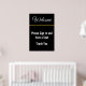 'Welcome' apparaît dans un élégant script blanc en haut de cette affiche d'entreprise noire. 'S'il vous plaît vous connecter et avoir un Merci de siège' apparaît en blanc en bas. Les faux lignes d'or ne sont pas faits de papier peint.