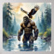 Poster de Bigfoot. Un Sasquatch musclé avec un aigle qui atterrit sur son épaule pendant qu'il marche à travers une rivière dans une forêt.