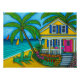 Un tableau de Lisa Lorenz d'une scène tropicale vibrante et joyeuse d'une maison de plage colorée et cosy le long d'une plage de bord de mer turquoise.