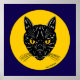 A retro-looking illustration of the face of a yellow-eyed black cat appears in a moon-like circle in this original Halloween-appropriate art by Richard H. Fay.