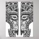 Ce design unique présente deux masques stylisés faisant face. Les deux masques se réunissent pour former une illusion optique d'une troisième face, en regardant vers l'avenir. Des lignes et des tourbillons peints sur le motif, inspirés de l'art des civilisations maya et aztèque. Ce motif complexe est un design de masque élégant et unique.