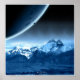 Une planète de cratère robuste apparaît au sommet des montagnes avec sa lune.