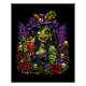 Cartoon-style illustration with a green-skinned zombie fairy with purple bat-like wings. Her hat is adorned with skulls, olives, bacon, and celery. She holds a Bloody Mary cocktail and is surrounded by a dark background with red roses, dark berries, purple flowers, and small skulls.