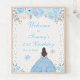 Ce panneau de bienvenue élégant et glamour pour les fêtes d'anniversaire d'hiver présente une belle princesse aux cheveux brunes et à la peau claire dans une robe bleue. Le texte combine écriture manuscrite et polices sans serif modernes pour un look élégant et sophistiqué. Les compositions florales, les flocons de neige et les confettis argentés créent un mélange parfait de rustique et de chic. Graphiques par www.etsy.com/uk/shop/SunflowerDayLove