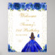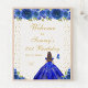 Ce panneau de bienvenue élégant et glamour pour la fête d'anniversaire présente une belle princesse aux cheveux brunes et à la peau claire dans une robe de bal bleu royal. Le texte combine écriture manuscrite et polices sans serif modernes pour un look élégant et sophistiqué. Les compositions florales, les papillons et les confettis d'or créent un mélange parfait de rustique et de chic. Graphiques par www.etsy.com/uk/shop/SunflowerDayLove