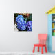 Poster photographique en forme de carré. Fleurit bleu violet avec des feuilles vert foncé, cette vivace pousse dans un jardin tropical à côté de plantes rayés roses et d'une grande coquille de conque. Ce grand mur peut être transféré vers un autre produit de votre choix.