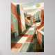 Boho desert pathway winding through geometric arches and terracotta walls, with saguaro cactus and golden sunset glow. Teal shadows, clean blocky shapes, and subtle textures create a serene Southwestern mood. Perfect for living room, office, or boho bedroom decor—high-resolution digital landscape art.