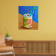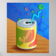Illustration d'une boisson gazeuse en conserve avec une paille et des bulles qui en sortent reposant sur une table en bois. Image disponible sur divers cadeaux et produits. Posters. Tirages.