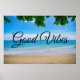 Une affiche qui dit : de bonnes vibes avec une photo de paysage d'une plage tropicale. Sable chaud, eau azur et ciel bleu avec des feuilles tropicaux le long du sommet.